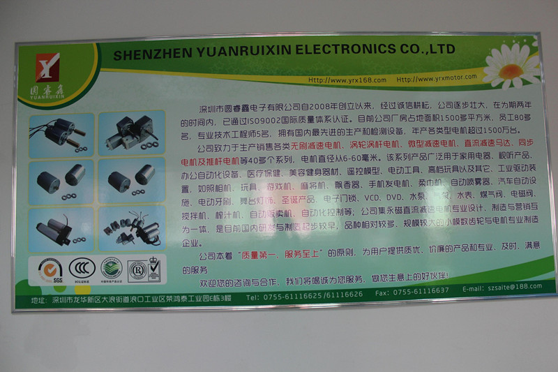 深圳市圓睿鑫電子有限公司自2008年創(chuàng)立以來,經(jīng)過誠信耕耘,在為期兩年的時間內(nèi),已通過ISO9001:2000國際質(zhì)量體系認證。公司廠房占地面積2000多平方米,員工100人,專業(yè)技術(shù)工程師6名,擁有國內(nèi)最先進的生產(chǎn)和檢測設備,年產(chǎn)各類減速電機超過2~300萬臺。因公司發(fā)展需要,于2020年底,將生產(chǎn)基地遷往擁有最美小鎮(zhèn)之稱的東莞市清溪鎮(zhèn),依山傍水,依托美麗的大自然環(huán)境和地方文化,全新的東莞市圓睿鑫電子有限公司將借助深圳母公司平臺,一步步走上新的臺階。